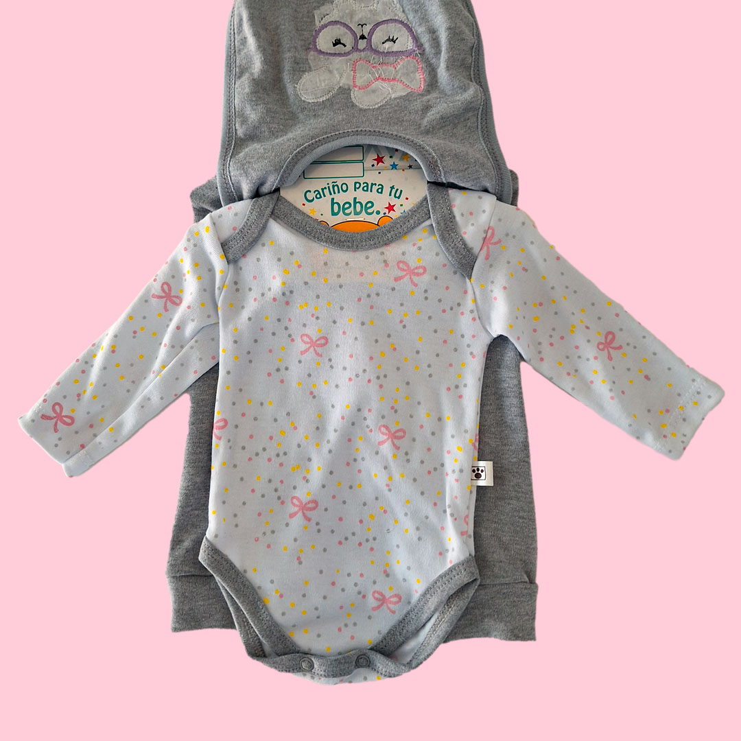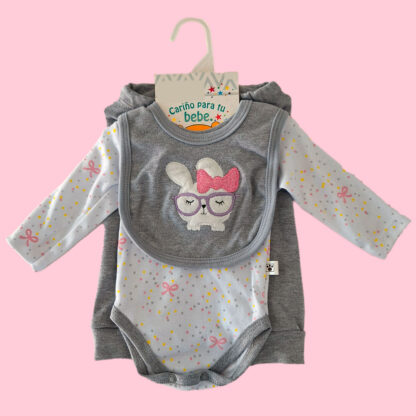 Conjunto de 3 piezas Cariño para bebé niña, incluye  pañalero, babero y pantalón.